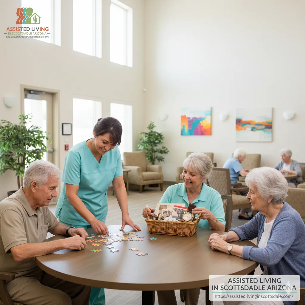 Music therapy with live guitar, desert-garden walks in a secured courtyard, ice-cream social at 3 p.m.—keeps minds engaged and blood sugar steady.